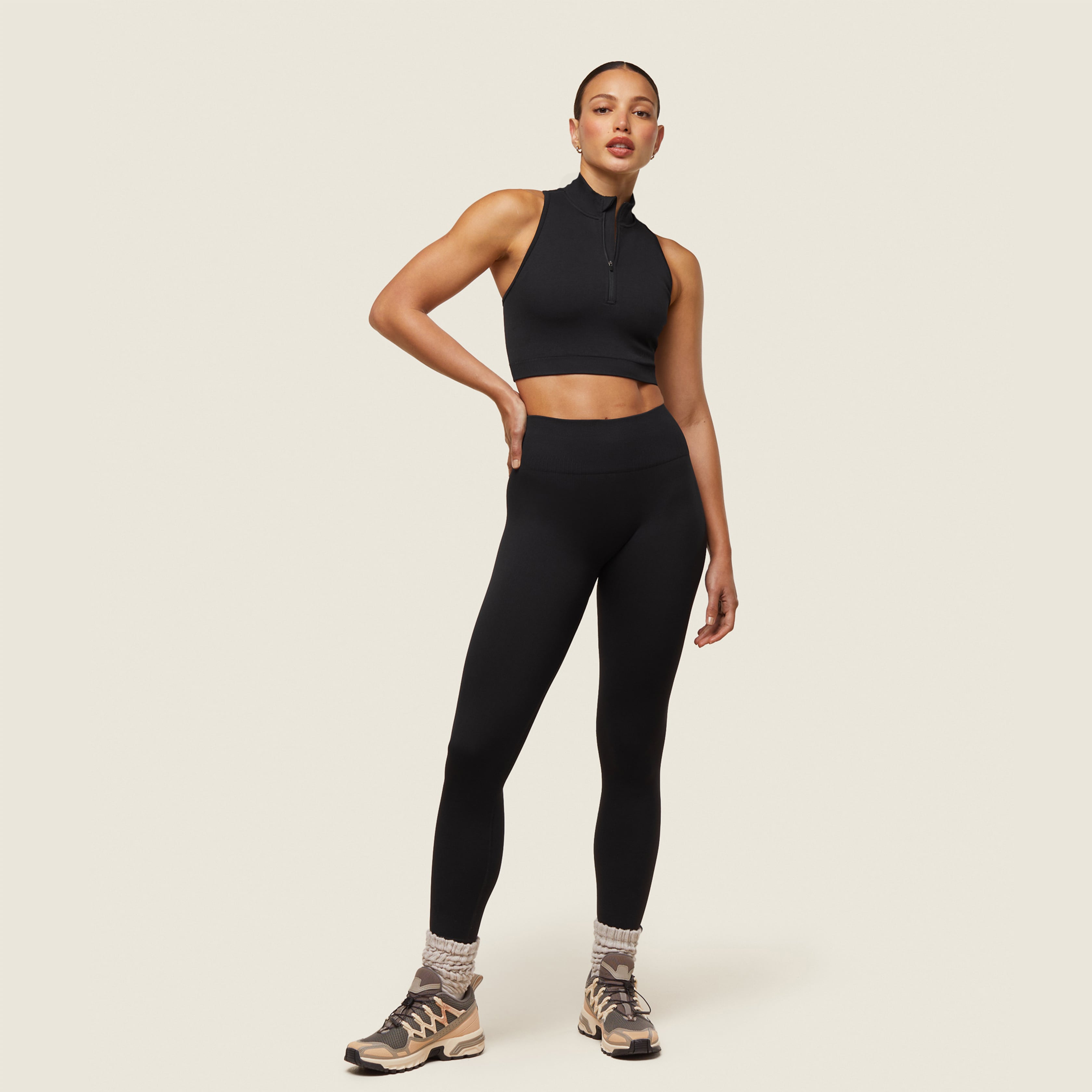 Your choice of footwear can really make or break a hike. Ever seen someone hiking in regular sneakers? That shouldn’t be you. Hiking footwear is designed for grip, stability and comfort. Pair your leggings with hiking hiking boots for rugged trails and long hikes, or trail sneakers for more forgiving terrain or short walks. A little styling tip? Let chunky walking socks peel out of your boots for a cute and cozy touch to a practical style.